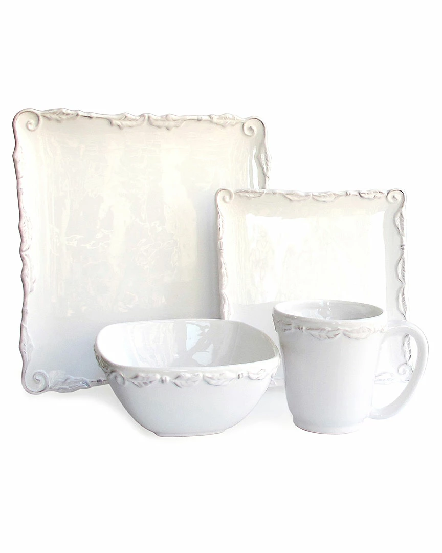 - Flip through your recipe books, mix up some drinks, and invite over your friends – it’s time for brunch! Before the guests arrive, set the scene for your sophisticated soiree. First, place a distressed oak table and white Parsons chairs in your dining room, then top your table with this elegant dinnerware set. The sixteen pieces are perfect for any occasion, while the crisp white finish and scrolling border detailing imbue this set with cottage-chic charm. Next, pair these pieces with a blue and white striped runner and a pink hydrangea centerpiece. Now that your table’s set, bring out a stack of chocolate chip waffles, a pitcher of mimosas, and spinach quiche, then sit back and enjoy your delicious spread with friends.