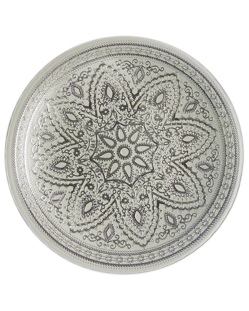 - Use this glass silver charger plate with beatifully intricate details to add elegance and sparkle to your table setting